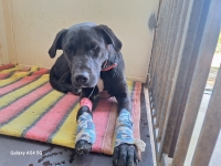 Od 08/05/2025 pies przebywał w lecznicy weterynaryjnej. Został odrobaczony, zaczipowany i zaszczepiony przeciwko wściekliźnie. Pies podczas przeciskania sie przez kraty poranił sobie kończyny. Rany zostały opracowne i zeszyte. Pies w dniu 13/05/2025 został przywieziony i zabezpieczony w schronisku w Orzechowcach.